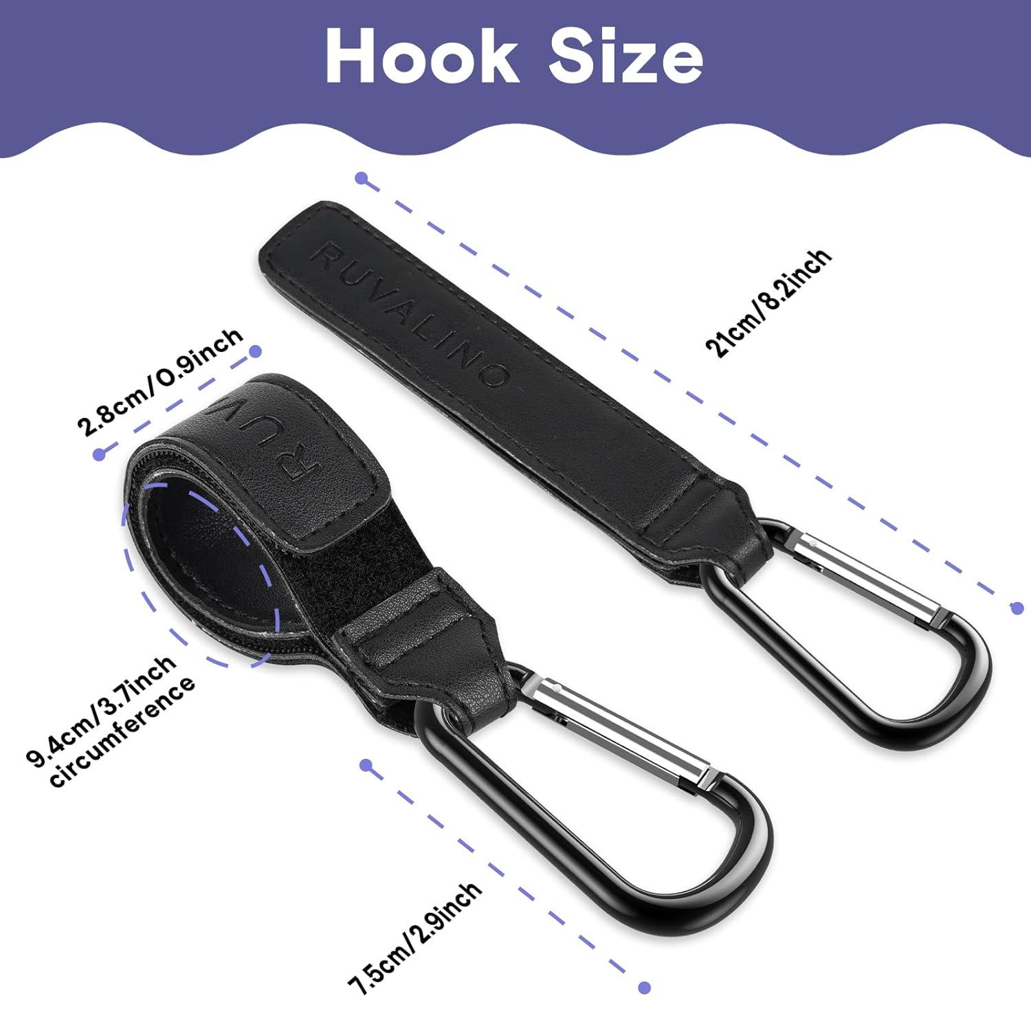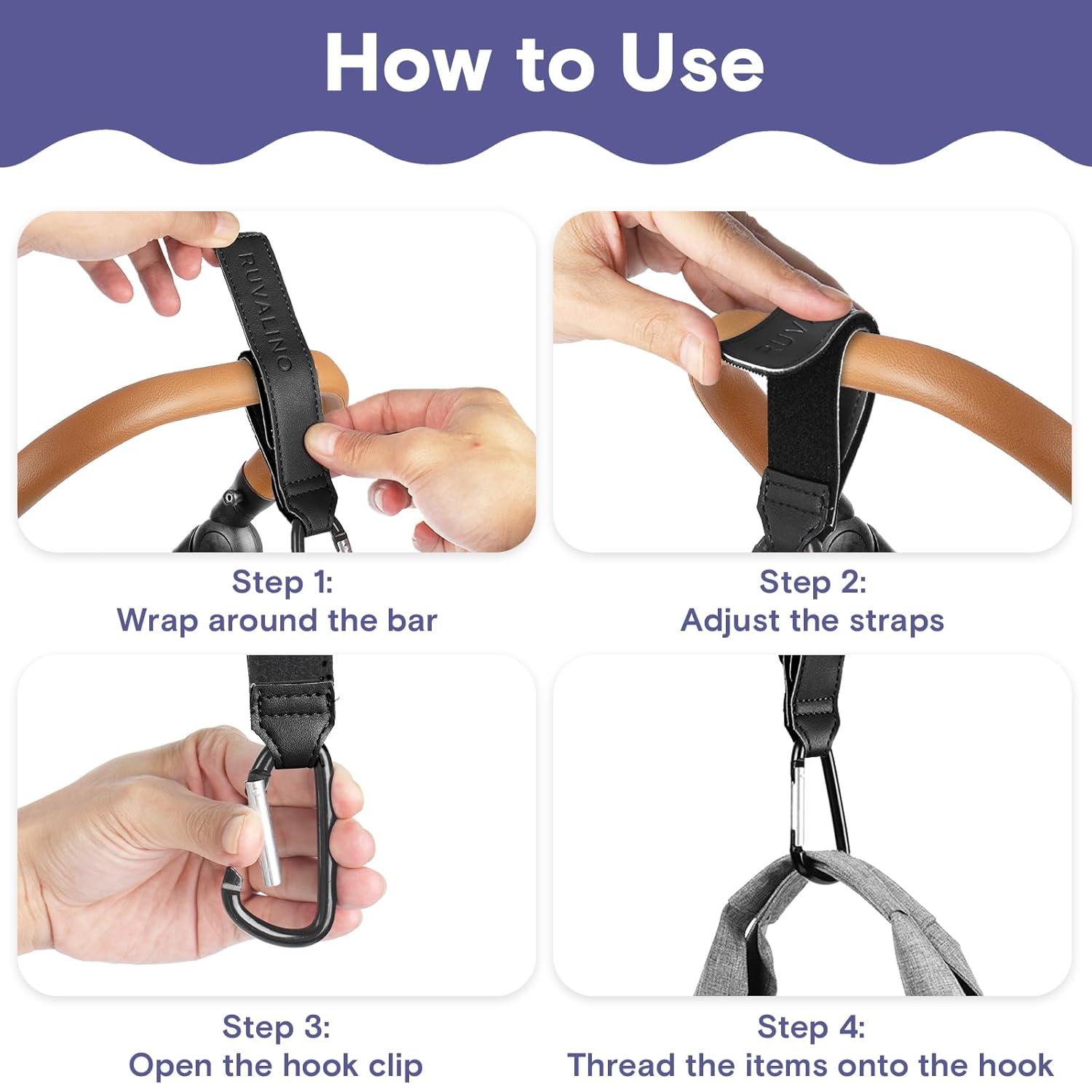 SECOND PAIR OF HANDS: Instead of storing items in the bottom of your stroller, keep your essentials within arm's reach with the RUVALINO leather stroller Hooks. Easily attach to any stroller’s handle with the super strong Velcro, ensuring a secure grip that won't budge, freeing your hands from heavy shopping bags while shopping or running errands