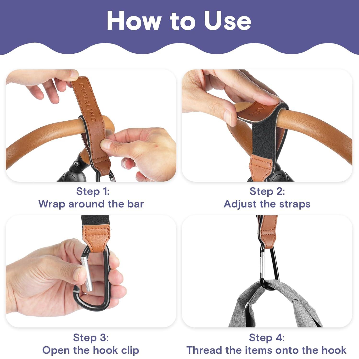 SECOND PAIR OF HANDS: Instead of storing items in the bottom of your stroller, keep your essentials within arm's reach with the RUVALINO leather stroller Hooks. Easily attach to any stroller’s handle with the super strong Velcro, ensuring a secure grip that won't budge, freeing your hands from heavy shopping bags while shopping or running errands